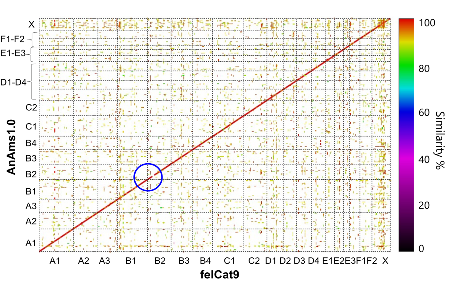 ▲構築された高精度の参照配列(AnAms1.0)と既存の参照配列(felCat9)のゲノム全体の比較。青丸で示した部分はとくに違いが大きい領域を示しています。