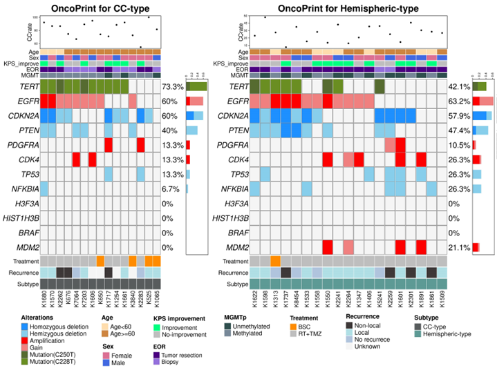 【分子学的解析】Glioblastomaに高頻度に認められるTERT, EGFR, CDKN2A, PTENといった変異の頻度は両タイプで有意差を認めませんでした。しかしながら、MGMTプロモーター領域のメチル化は有意に脳梁タイプで高率であることがわかりました。