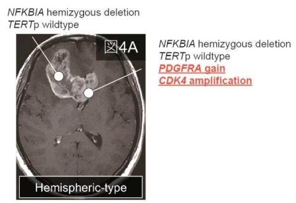 【マルチサンプリング解析】手術時にマルチサンプリングが6例で可能でありました。画像解析で大脳半球タイプであった3例のうち2例で、大脳半球腫瘍に比し脳梁部腫瘍で遺伝子変異の蓄積を認め、分子学的に大脳半球から脳梁方向に進展していることが示唆されました (代表例図4A)。一方で、画像解析で脳梁タイプであった3例全例で、大脳半球と脳梁の変異が同じでマルチサンプリングで進展方向を示唆することはできませんでした (図4B)。