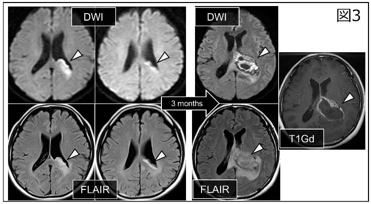 本疑問を解きうる画像が図3になります。脳梁に限局した異常信号が認められ、3か月後にbutterfly glioblastomaに変化していますが、腫瘍成分は脳梁に限局しています。即ち、腫瘍進展を解き明かしうる経時的画像を偶然にも取得できたことで、butterfly glioblastomaが脳梁からも発生しうるのだ、という着想に至りました。確かに、脳梁発生のglioblastomaが存在するのであれば、図2の症例に大脳半球成分がないことの説明がつきます。