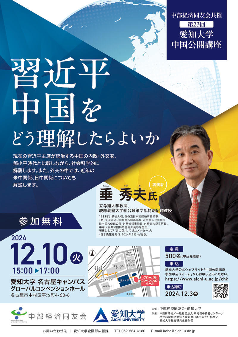 愛知大学は12月10日(火)、中部経済同友会との共催で中国公開講座23「習近平中国をどう理解したらよいか」を開催。元中華人民共和国特命全権大使で、立命館大学教授・慶應義塾大学総合政策学部特別招聘教授の垂秀夫氏を招き、現在の習近平主席が統治する中国の内政・外交を鄧小平時代と比較しながら、社会科学的に解説。また外交の中では、近年の米中関係、日中関係についても解説。参加無料、定員500名。