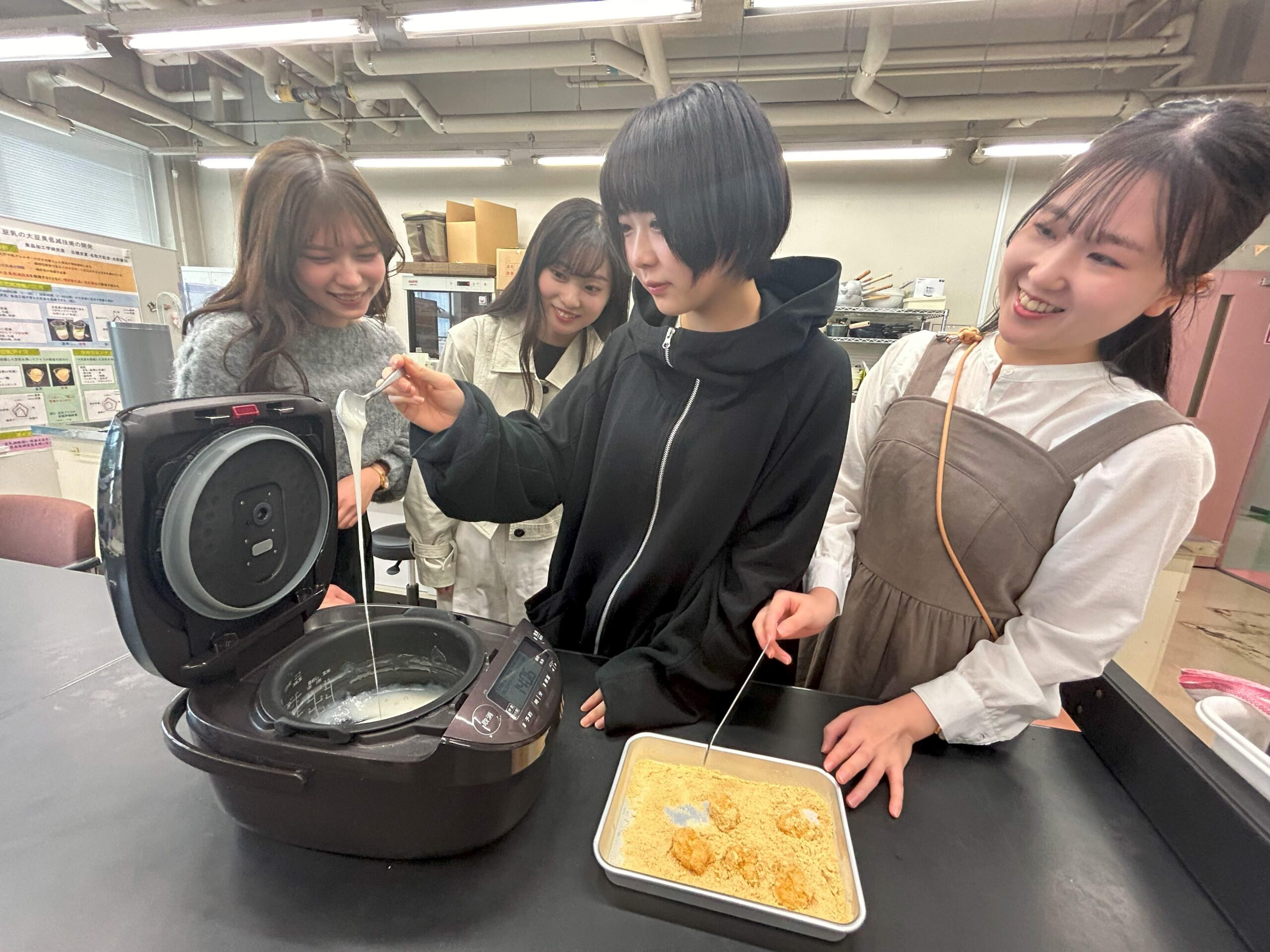 守田准教授は富山県のコメ農家の出身。同県農林水産総合技術センター食品研究所の研究員時代からコメの消費拡大に関心を持ち、食品素材を研究する中でコメ加工のアイデアを温めてきました。新素材の開発は本学に赴任した2020年から本格的に取り組み、加熱、冷却、磨砕、濃縮などの実験を繰り返し、食味などを試してコメがおいしくなるための素材の開発を研究してきました。最終的には、加熱後に磨砕するという従来からのコメ加工の常識とは逆に、水に浸した後に磨砕する「湿式粉砕」を採用した結果、人がざらつきを感じるといわれる20ミクロン以下の粒子にすることができるようになり、つるつる、もちもちした舌触りのなめらかな食感を得られたとのことです。もちなどに加工して喉に詰まりにくい高齢者の介護食としての用途に最適なほか、パンに加工した場合には空気を中に閉じ込めることでふっくらとした仕上がりにできるそうです。また、食感や風味が独特の玄米については、ビタミンB1の栄養はそのまま、より甘みが増すという特徴があります。