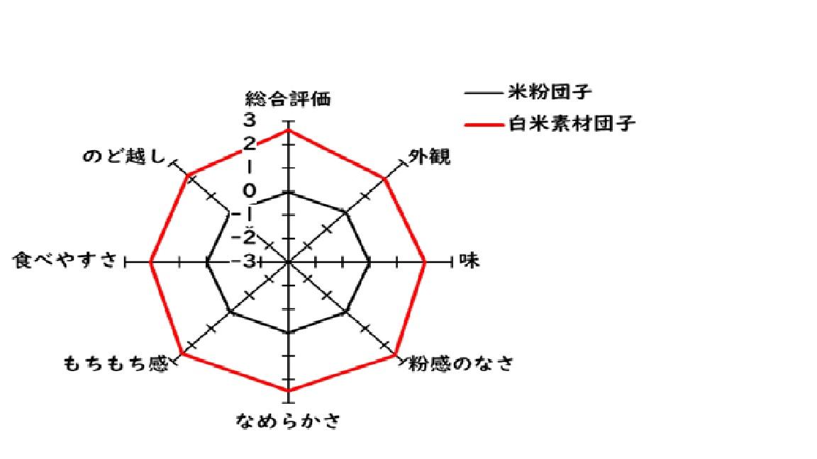 食味の変化を見るため、新素材と従来の原料を使った団子やパンを製造し、比較する実験を行いました。まず、白米を使った新素材と上新粉(米粉)を使った団子をそれぞれ調理。22人のゼミ生らに外観、食感、もちもち感、食べやすさ、味など8項目について官能評価をしてもらったところ、すべての項目で新素材の団子が上新粉の団子を上回る評価でした。特に、もちもち感で高い評価が得られました。