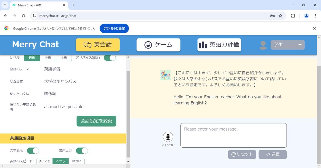 東京都市大学が生成AIを利用したオリジナル英会話学習システム「Merry Chat」を開発 ― レベルにあわせた英会話練習のほか、英語のゲーム機能も搭載