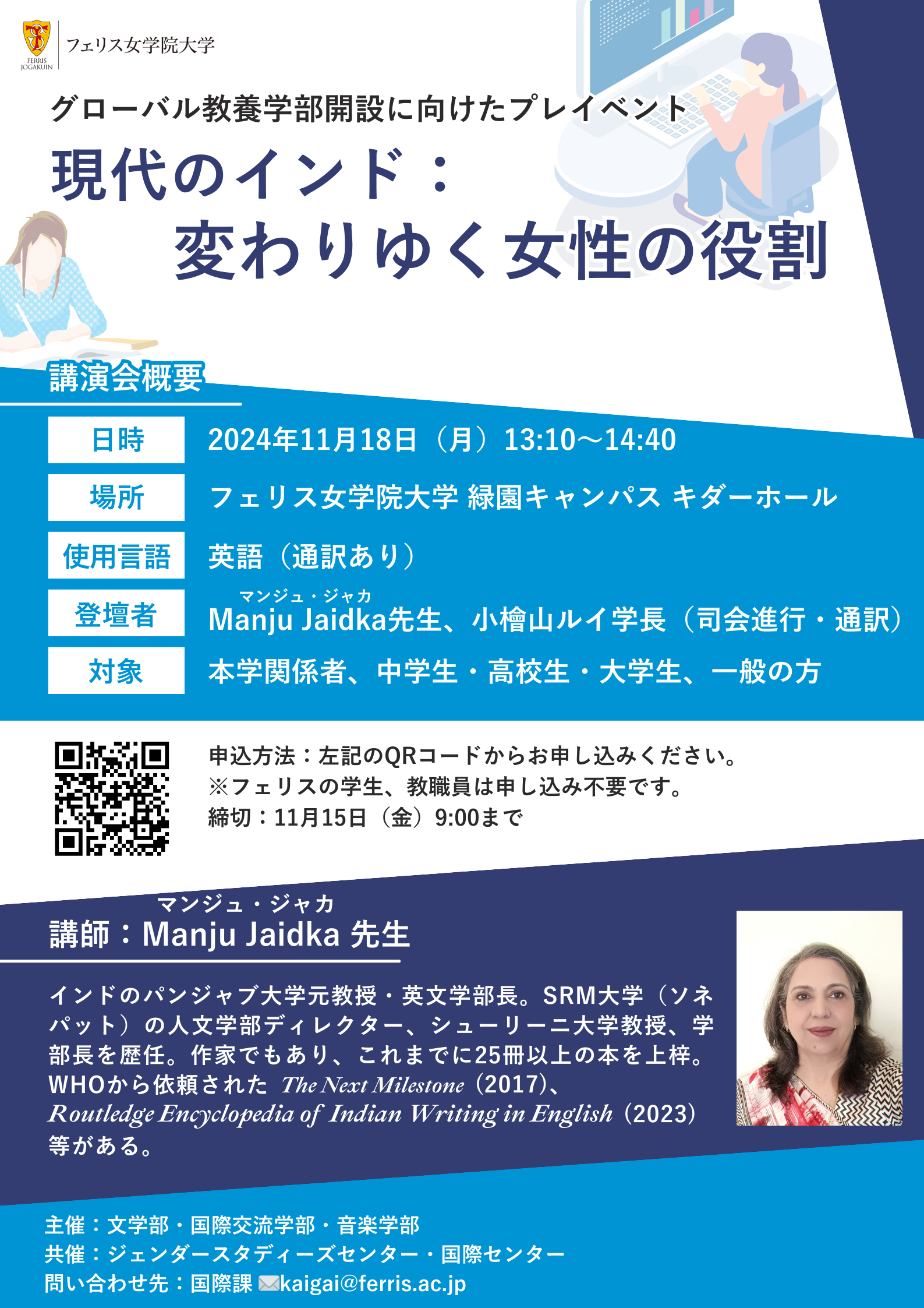 フェリス女学院大学(神奈川県/横浜市、学長:小檜山ルイ)は、インドのパンジャブ大学元教授・英文学部長であるマンジュ・ジャカ先生を講師にお招きし、2024年11月18日(月)に講演会「現代のインド:変わりゆく女性の役割」を開催します。司会進行・通訳は小檜山ルイ学長が担当します。