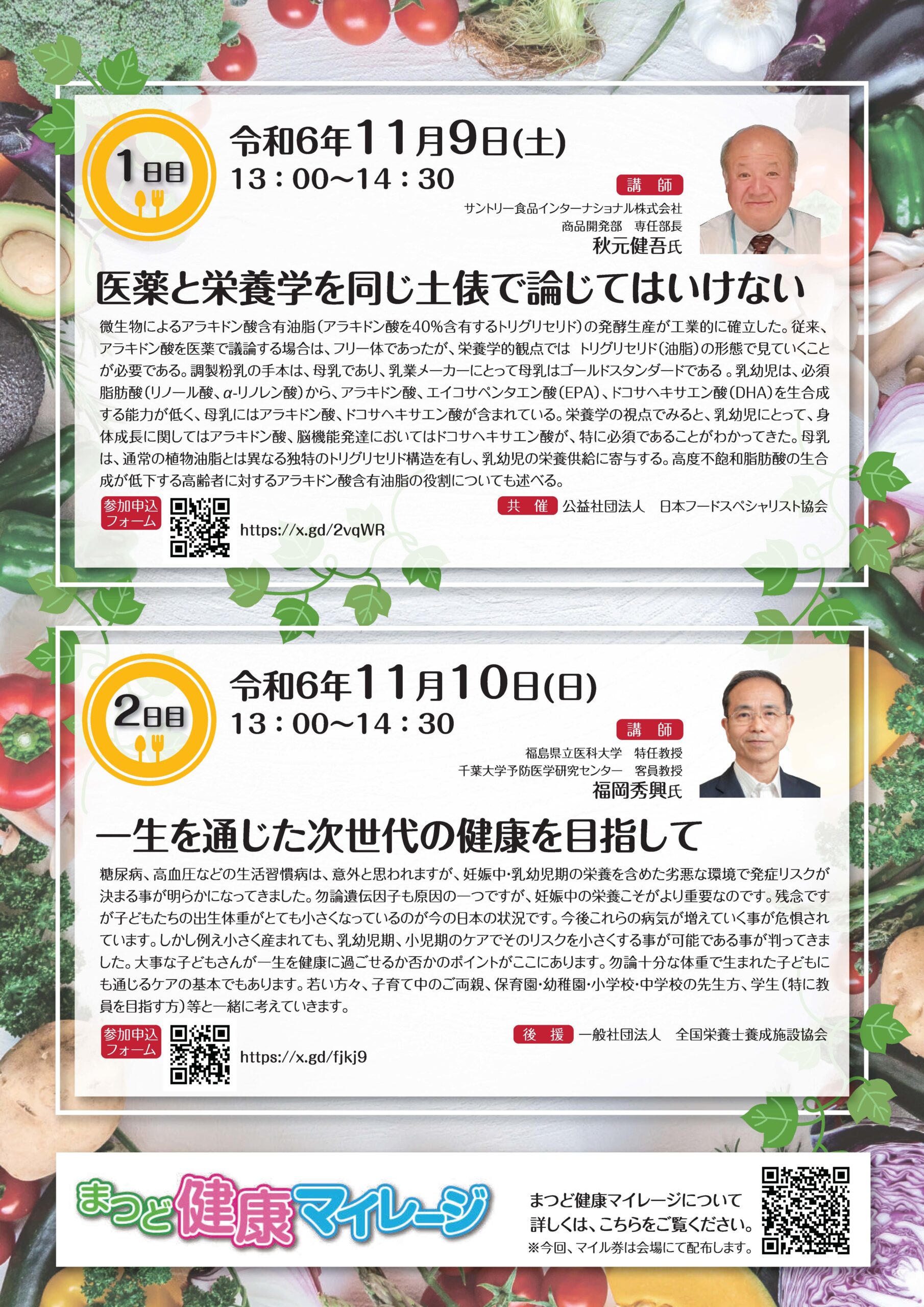 1日目は「医薬と栄養学を同じ土俵で論じてはいけない」、2日目は「一生を通じた次世代の健康を目指して」をテーマに、対面形式とZoomを使用してオンライン配信形式を併用して行う。参加費無料、要事前申込。