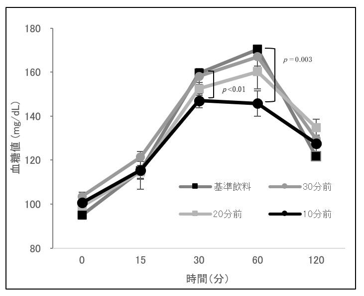 血糖上昇曲線下面積(IAUC)も、ご飯摂取の10分前に試験飲料を摂取させた場合に基準値と比較して、有意に減少( p=0.003)しました。
