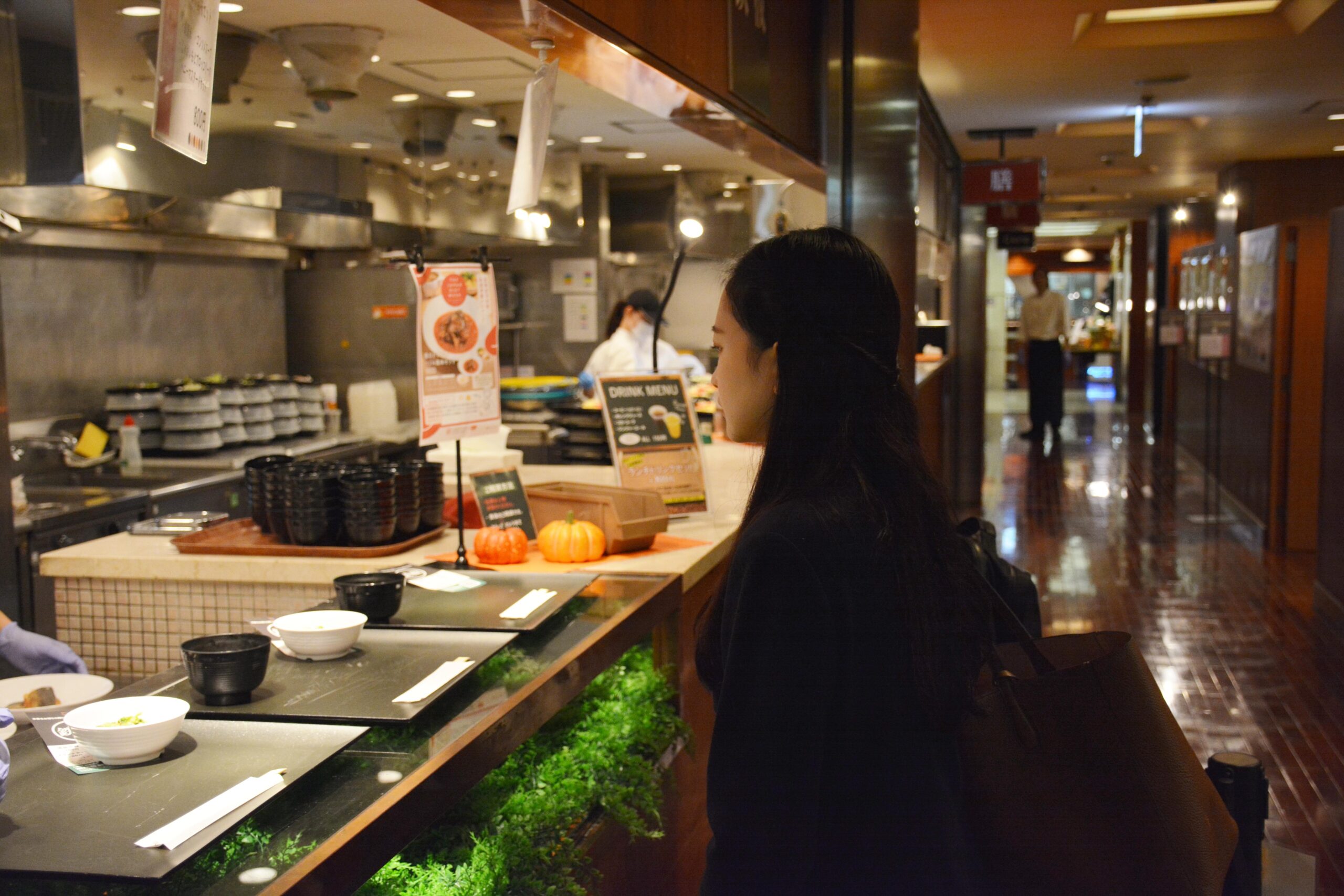 「THE JAPAN DIET WEEK」と題し、10月21日(月)~25日(金)にエームサービスの全国80か所の事業所で、学生が考案したセットメニューが提供され、一部事業所では連日完売するセットも出るほどの人気ぶりとなりました。期間中には、学生が事業所を訪れる機会をいただき、本ワークショップを指導した食物学科松月弘恵教授、亀山講師とともにお客様へのアンケート調査などを行いました。