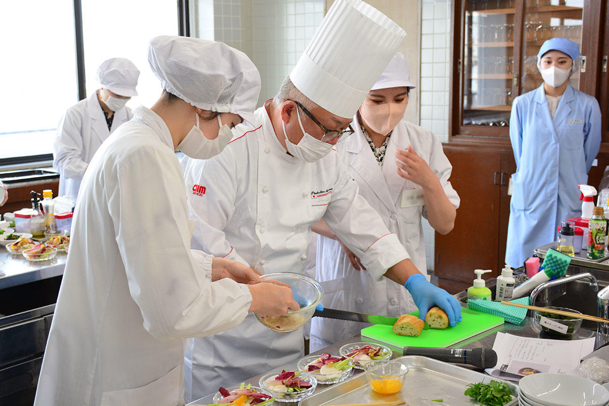 メニュー考案に先立ち、今年4月にエームサービスの石井幸雄シェフによる料理教室が開催されました。