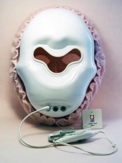 本研究では、被験者が自宅で簡便にセルフケアを実施できるように開発されたポータブル型顔型振動呈示装置(注5)を使用します(図3)。この装置は、自然音や音楽に含まれる低周波成分を振動として皮膚に伝える仕組みで、1日2回、各10〜20分間のセルフケアを行います。通院の必要がなく、日常生活に取り入れやすい設計です。
