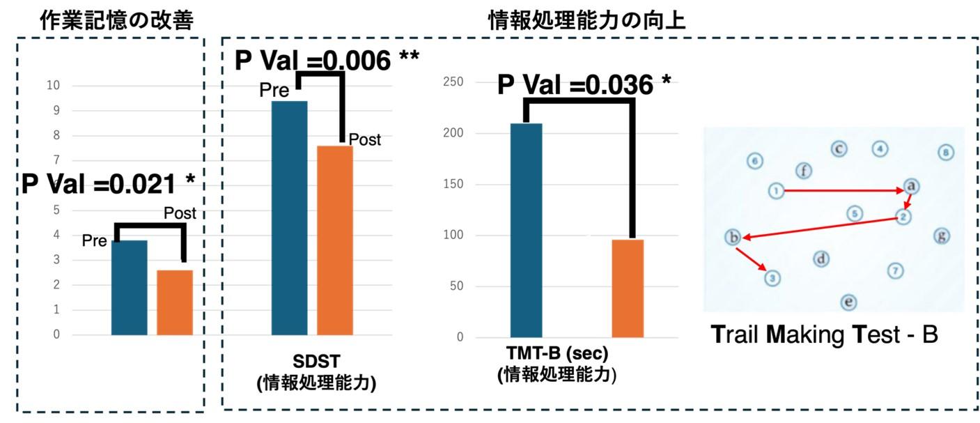基礎研究は秋田大学高齢者医療先端研究センターの大田秀隆教授らのチームと共同して行いました。MCIや軽度認知症の患者の方々への臨床研究では、音響用ウーファーから15-40Hz音を24時間、1ヶ月間連続再生することで暴露しました。その結果、作業記憶(Working Memory, WM)の向上や情報処理の能力の改善が確認されました(図1)。