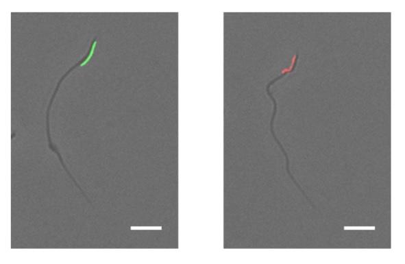 その結果、1µg/mLのアクリジンオレンジと150µMのPropidium Iodideを使用すると、染色時間0分(染色液を入れた直後)でも生きている精子と死んだ精子を十分に染めわけることができました(図2)。
