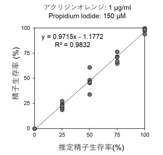 次に、この方法が正確に、実際の精子生存率を反映しているかを調べるために、生きた精子とあらかじめ加熱して死なせた精子を任意の割合で混ぜ、確立した方法を用いたところ、高い精度で生存率を推定できることが確認できました(図3)。