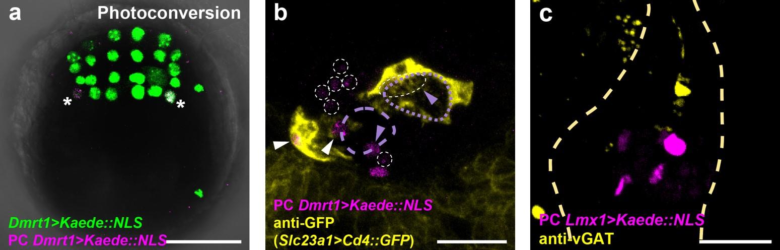 (a)ホヤ胚の神経板をKaedeという蛍光タンパク質で標識し、左右のa9.49細胞(*)に405nmレーザー光を照射してKaedeの蛍光を緑から赤に変換した(光変換)。(b)光変換後幼生まで発生させたところ、光変換されたa9.49細胞の子孫はメラニン色素細胞とグリア細胞に分化した。(c)同様の方法でa9.49細胞由来グリア細胞を変態後の幼若体まで追跡した(幼若体の脳の拡大図)。a9.49細胞の子孫の一部は成体脳の神経前駆細胞になる。