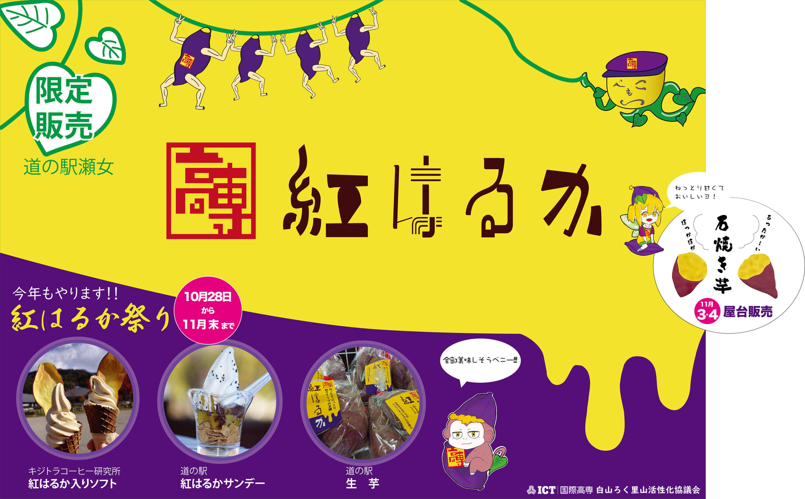 国際高等専門学校では2年生が「エンジニアリングデザイン」の授業一環で、学生自ら栽培したサツマイモの紅はるかを使った「紅はるか祭り」を10月28日(月)から11月末まで、国際高専白山麓キャンパス真向かいの「道の駅瀬女」と「キジトラコーヒー研究所」で開催します。