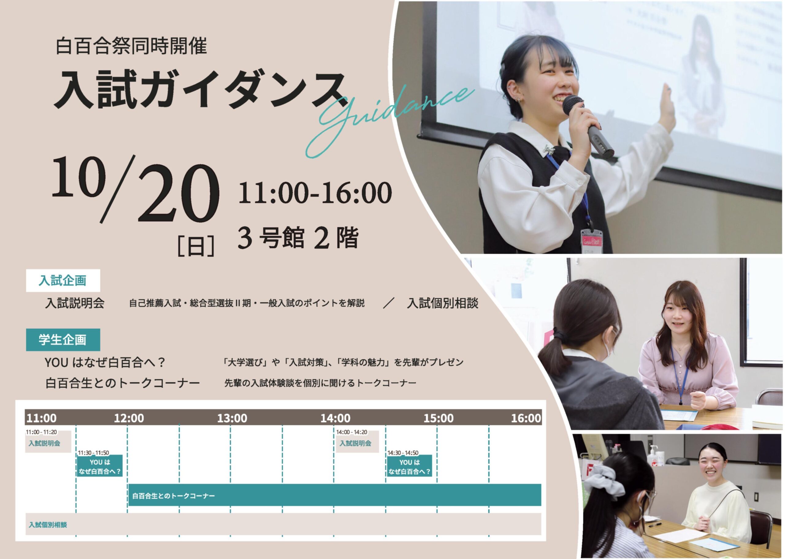 20日(日)に開催する「入試ガイダンスin白百合祭」では、入試の概要や小論文・エントリーシート・面接対策など受験生が今知りたい情報をお伝えする入試説明会、白百合生とのトークコーナー、入試広報スタッフによる入試相談コーナーに加え、在学生が大学選びで大切にしたことや行った入試対策、学科の魅力を学生目線で語る『Youはなぜ白百合へ?』を実施する。