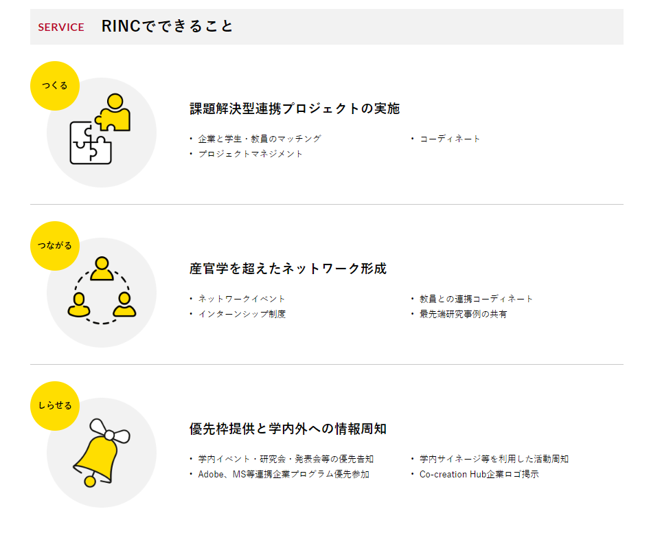 2024年度より、「社会共創推進本部」を設置し、政府・地方自治体、産業界や地域社会、世界の大学や研究機関とも連携した社会課題の発見・解決、新しい価値の創出に向けた教育・研究に取り組んでいます。その拠点として、2024年4月に竣工した新棟(H棟)に、企業と大学・教員・学生の社会共創の拠点「Co-Creation Hub」を設置、「RINC」を展開し、大学と企業の接続、会員企業同士のネットワーキング、学生とのプロジェクト創出等を行います。