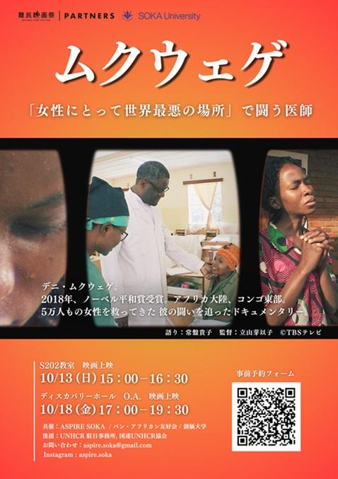 本映画祭は、国連アカデミック・インパクトへの参画を機に発足した学生団体「ASPIRE SOKA」との共催で、2018年より毎年開催しています。今回上映する『ムクウェゲ~「女性にとって世界最悪の場所」で闘う医師』は、性被害を受け続けているコンゴ民主共和国・東部ブカブの女性たちの多くを無償で治療してきた婦人科医デニ・ムクウェゲの闘いの日々を追ったドキュメンタリーです。18日(金)の上映会では、本学のパン・アフリカン友好会のアフリカのダンスもご覧いただけます。