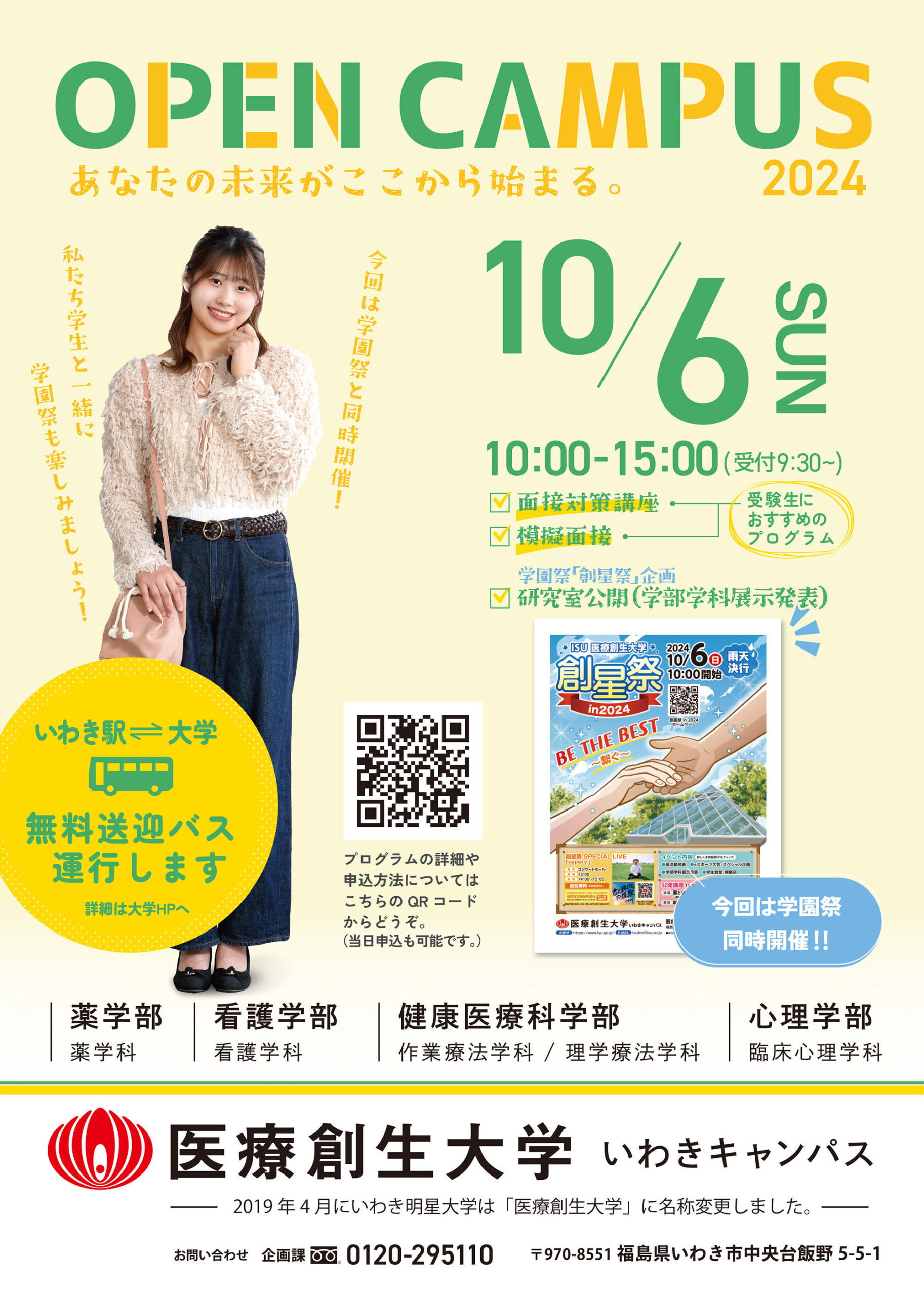 医療創生大学は10月6日(日)、いわきキャンパス(福島県いわき市)で学園祭「創星祭」を開催する。シンガーソングライター「HIPPY」や卒業生タレントの木村沙由里さんのスペシャルライブをはじめ、e-Sports大会、薬学部公開講座といった多彩な企画を用意。また、当日はオープンキャンパスも同時開催される。いずれも入場無料、一部企画は申し込みが必要。