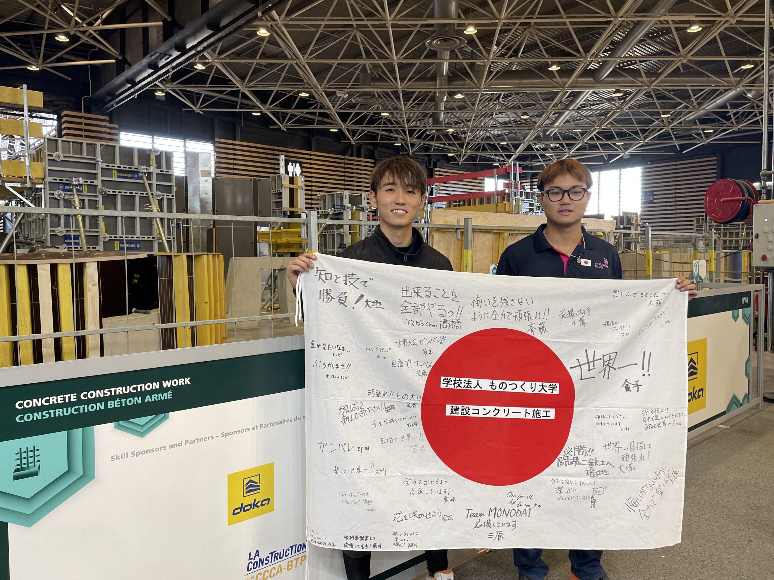 今大会では、各国から60職種・約1,313人の選手が参加し、ものつくり大学からは田子さんのほか、建設コンクリート施工職種に建設学科3年の坂本匠さん、笹野隼平さんが出場しました。