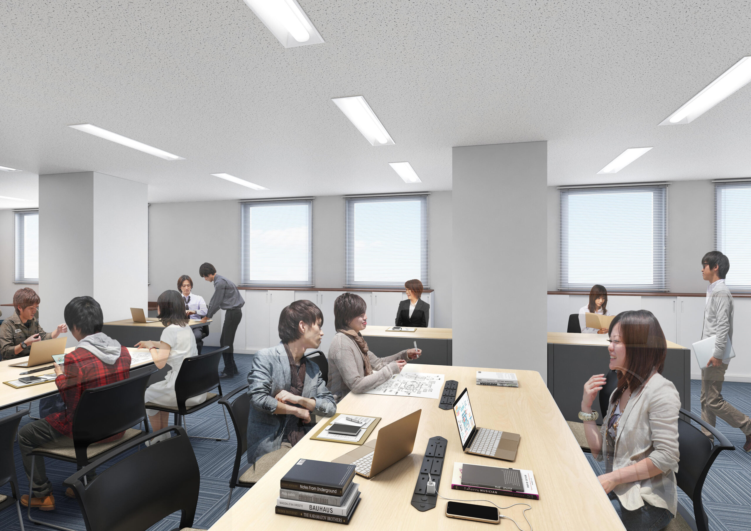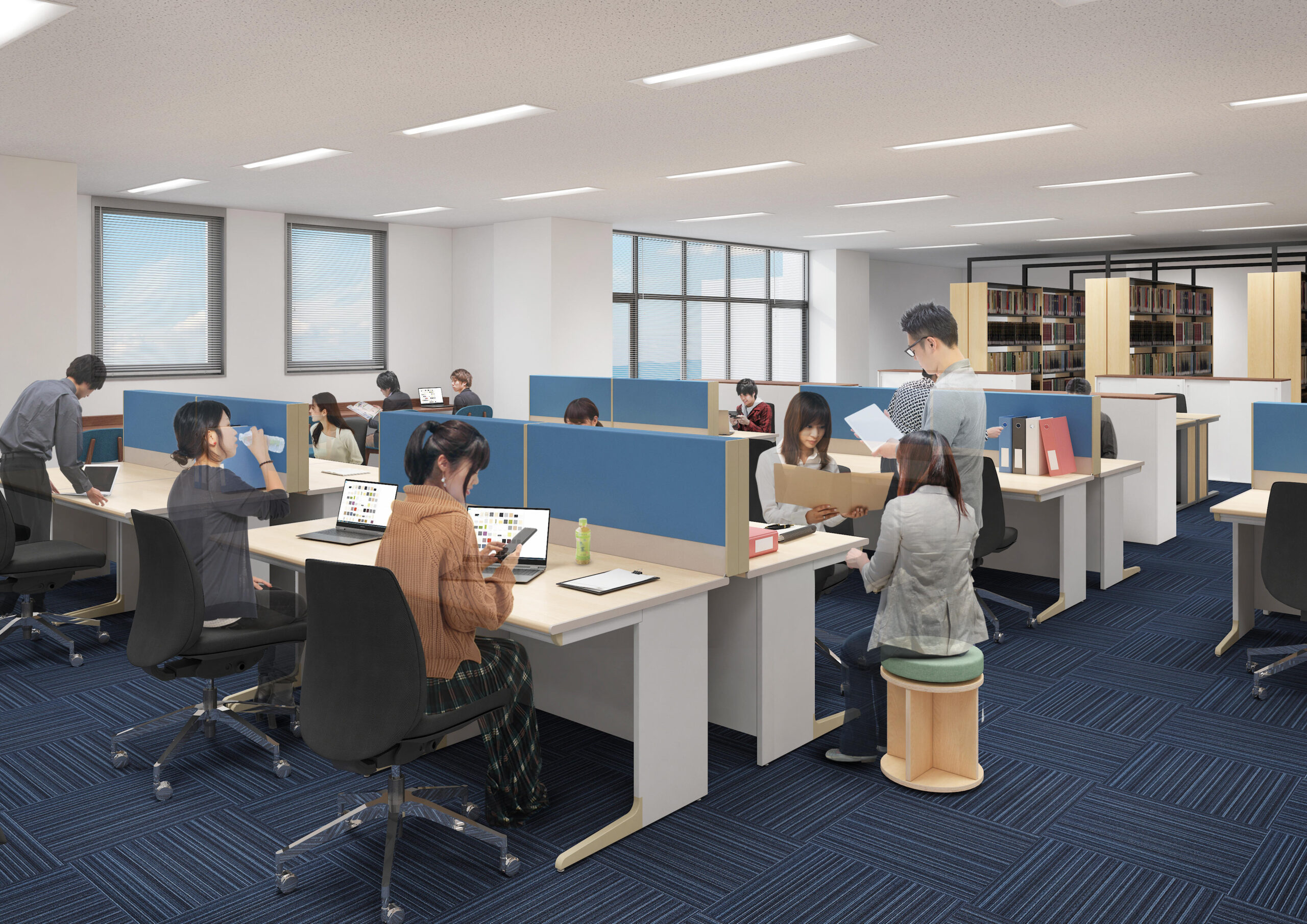 各研究室を仕切る壁はなくワンフロアで、研究室ごとに専門分野の図書を配架し、利用者はすべての分野の図書を自由に使用可能。どの研究室からでも印刷や複写ができるようにプリンターとコピー機が置かれています。