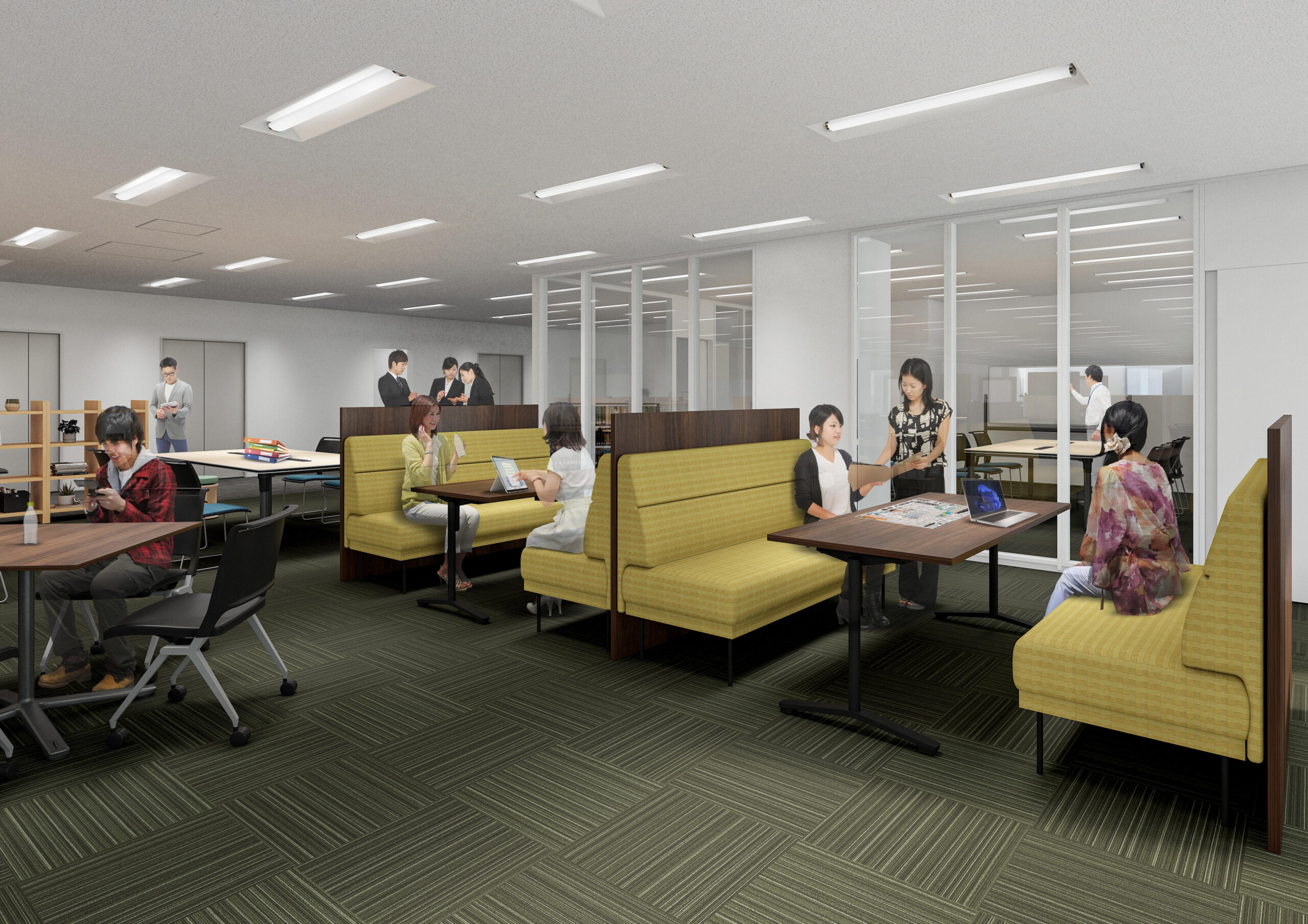 中央エリア席や3つあるワークショップルームは、セミオープンタイプ、個室タイプなど、用途に合わせて自由に利用できる作りです。打ち合わせやグループワーク、勉強会がいつでも開催できます。
