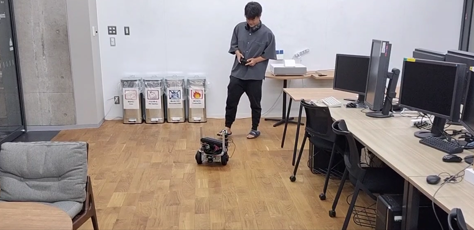 “i2labot”は自律走行とコントローラによる操縦が可能です。デモストレーション動画では、衝突防止のため、自律走行中であっても担当者がコントローラによる操縦可能の状態で待機しています。