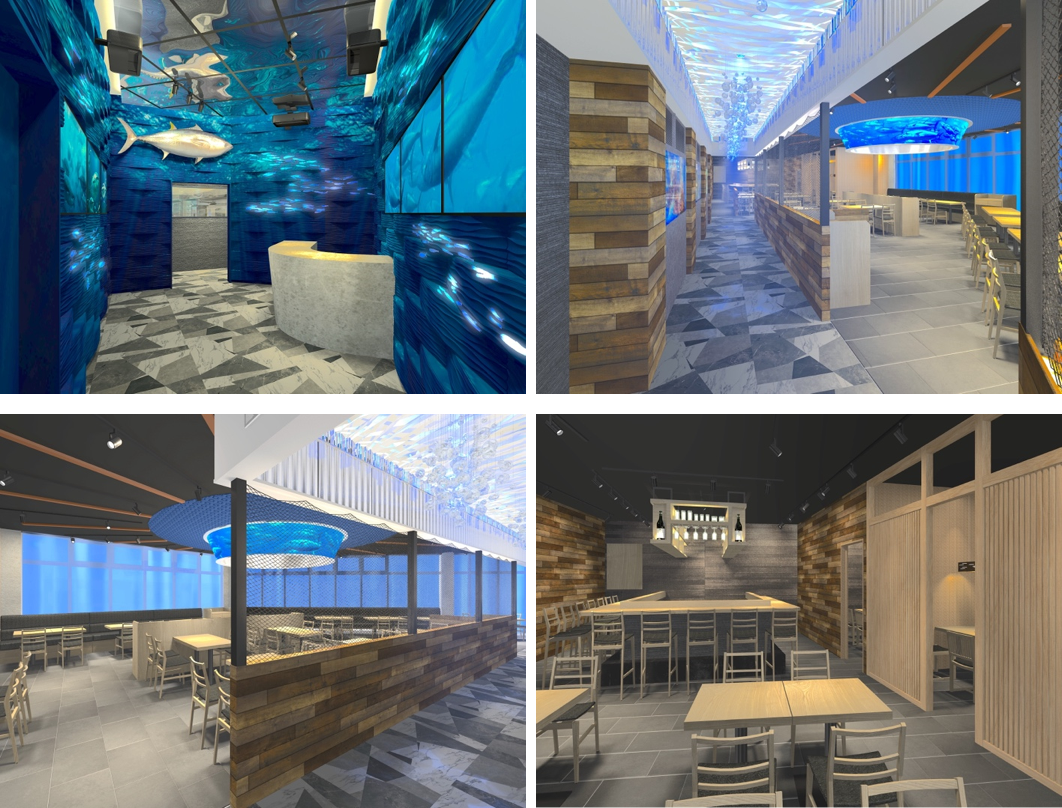 近畿大学は、昭和45年(1970年)大阪万博の「キッコーマン水中レストラン」で、当時は非常に珍しかった養殖魚を展示し、それから数十年の間に養殖技術を飛躍的に向上させました。今回の店舗には、そのオマージュとして水槽を設置しており、クエタマとその両親であるクエやタマカイ、ニホンウナギを鑑賞いただけます。さらに、映像や光・音響によって、海底をイメージした幻想的な空間を演出します。