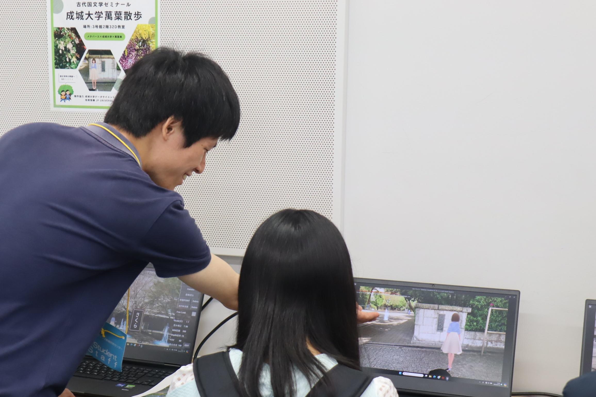 今回のPBL型授業で制作に取り組んだのは、キャンパスの3次元デジタル空間をアバターが移動しながら、萬葉歌プレートとその解説文を読むことができるというものです。学生たちは和歌の解説文作成から空間の素材となる写真の撮影、3次元デジタル空間の制作を行いました。約2か月をかけて完成した作品は7月14日(日)、8月3日(土)、4日(日)のオープンキャンパスで来場者に展示・紹介されました。