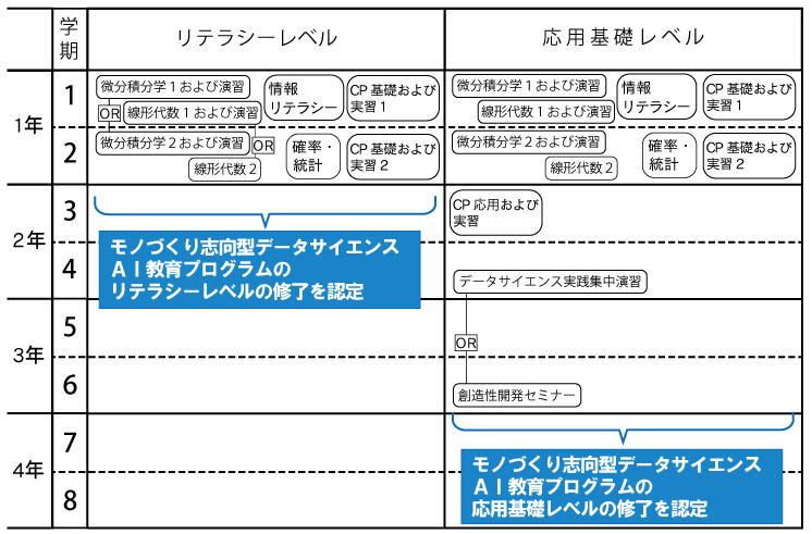 本プログラムは、「リテラシーレベル」と「応用基礎レベル」という学習水準の異なる2つの種類のプログラムから構成されており、内容は文部科学省の「数理・データサイエンス・AI教育プログラム認定制度」のそれぞれのモデルカリキュラムに準拠しています。
