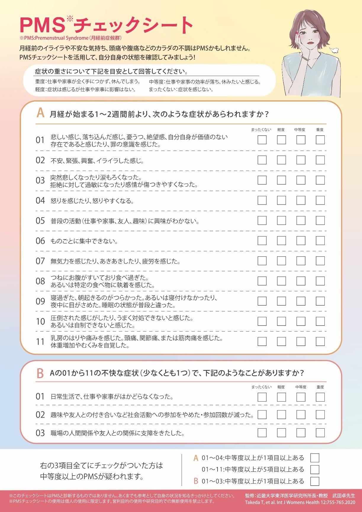 近畿大学東洋医学研究所所長・教授 武田先生の監修のもと、PMSチェックシートを作成しました。月経前のイライラや不安な気持ち、頭痛や腹痛などのカラダの不調を感じている方は、PMSチェックシートを活用して、自分自身の状態を確認してみましょう。