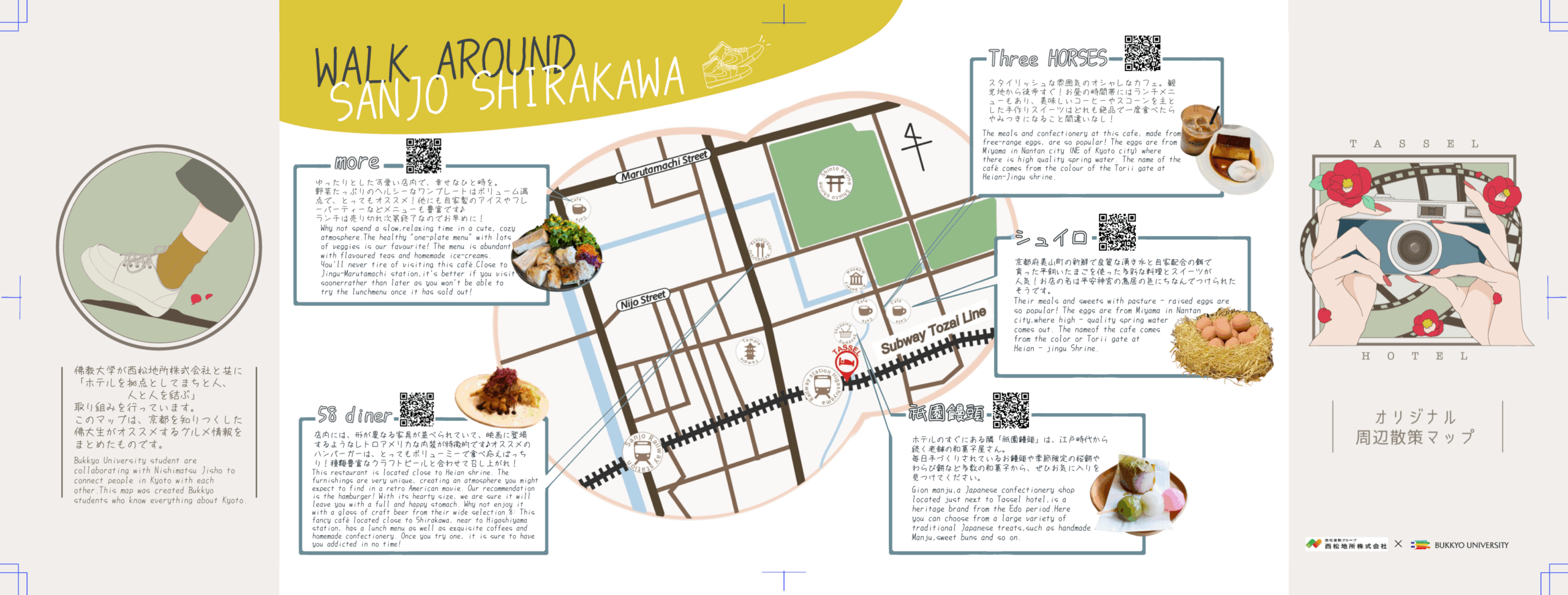 佛教大学(京都市北区)の学生が、西松地所株式会社が運営するホテル「タッセルイン京都 河原町二条」、「タッセルホテル三条白川」と合同で、各ホテルから徒歩圏内のグルメ情報をまとめた「オリジナル周辺散策マップ」を作成しました。