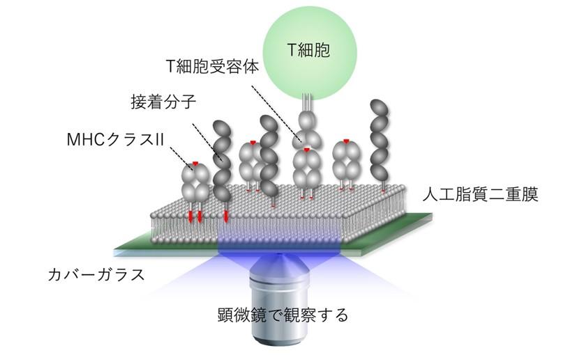 本研究室はこれまで、抗原提示細胞やがん細胞の細胞膜を模倣した人工平面脂質膜(SLB)と超解像顕微鏡とを用いることで、1分子レベルの解析も可能な独創的かつ先端的な分子イメージングシステムを構築してきました(Yokosuka et al,, Nat Immunol (2005))(図2)