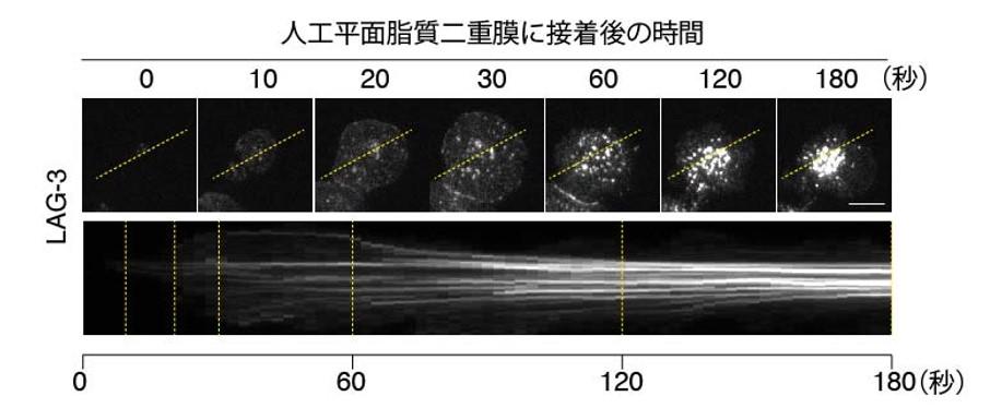 今回、T細胞上のLAG-3の動きを解析するため、LAG-3の1細胞分子イメージングの新たな実験系を確立しました。まず、LAG-3のリガンドであるMHCクラスII(MHC-II)を組み入れた「人工がん細胞脂質二重膜」を作成し、その上にLAG-3を発現しているT細胞をのせ、LAG-3の挙動を観察しました。T細胞は数分をかけて脂質二重膜に接着し、MHC-IIとの結合を機にLAG-3分子が数十個集まったクラスターが形成され、その後、LAG-3クラスターは真ん中に集まっていくのが観察されました(図3)。