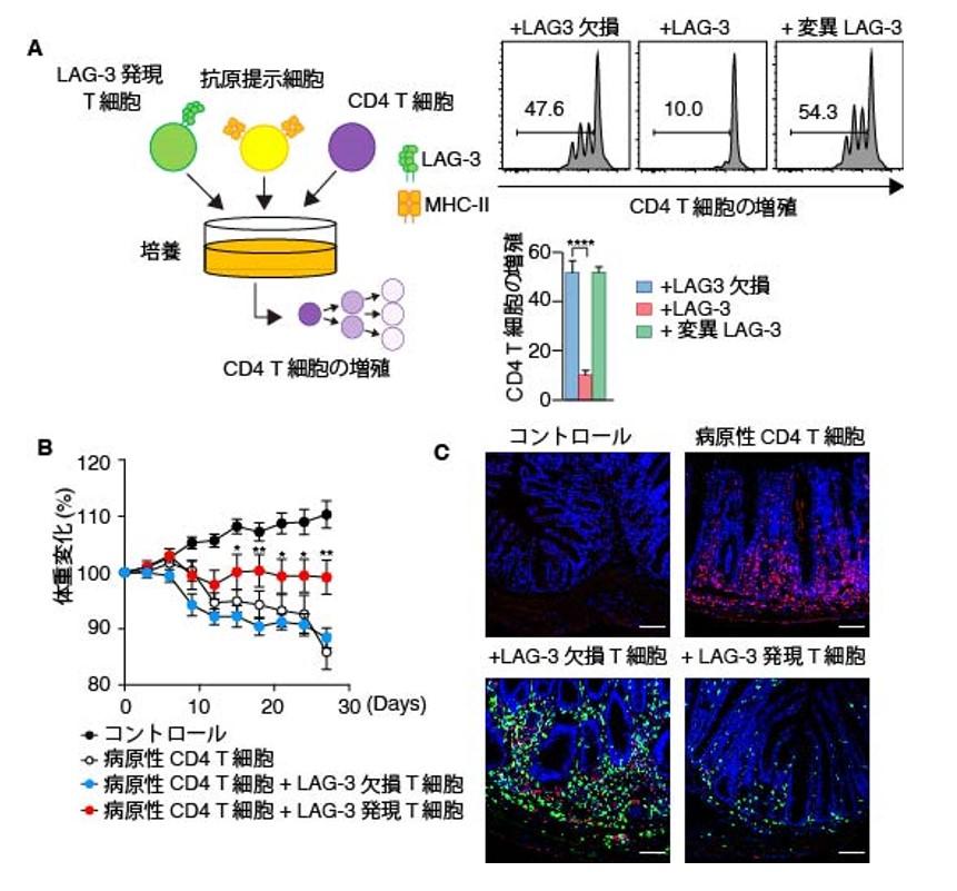 図5でLAG-3発現T細胞が抗原提示細胞上のMHC-IIを減少させることがわかりました。MHC-IIはCD4 T細胞の活性化に必須の分子であることから、LAG-3発現T細胞によってMHC-IIが減少した抗原提示細胞がCD4 T細胞を活性化する能力を失っているかを評価しました。その結果、図5でMHC-IIの取り込みが起こらなかったLAG-3欠損、および変異LAG-3を発現したT細胞との培養ではCD4 T細胞は分裂しましたが、LAG-3発現T細胞との培養では、CD4 T細胞が分裂できなくなることが認められました(図6A)。個体の中でも同様にLAG-3発現T細胞がCD4 T細胞の活性化を抑制するかを評価するために、CD4 T細胞が病原性T細胞として働くことで発症する腸炎モデルで検証しました。その結果、LAG-3欠損T細胞を病原性T細胞と共にマウスに移入しても、体重減少に違いは認められませんでしたが、LAG-3発現T細胞と共に移入することで、体重減少が抑えられることがわかりました(図6B)。また、病変部位である大腸を組織学的に解析したところ、病原性CD4 T細胞のみ、もしくは病原性CD4 T細胞とLAG-3欠損T細胞を移入したマウスと比較して、LAG-3発現T細胞を共移入したマウスでは大腸に病原性CD4 T細胞(赤色)が少ないことがわかりました(図6C)
