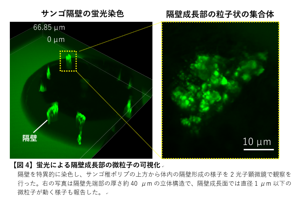 サンゴを含む海洋生物の骨格形成過程に関する研究で、走査型2光子励起レーザー顕微鏡(以下、2光子顕微鏡)を使用したことも本研究の特徴です【図4】。本研究では、サンゴ稚ポリプの口側(上部)より、隔壁の石灰化中心に存在する微粒子の動態観察に成功しました。