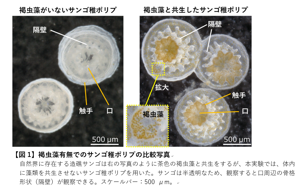 褐虫藻を体内に保有していないサンゴ稚ポリプを研究に使用し【図1】、サンゴの隔壁形成【図2】の初期で発生する石灰化中心の形成過程を報告しました。