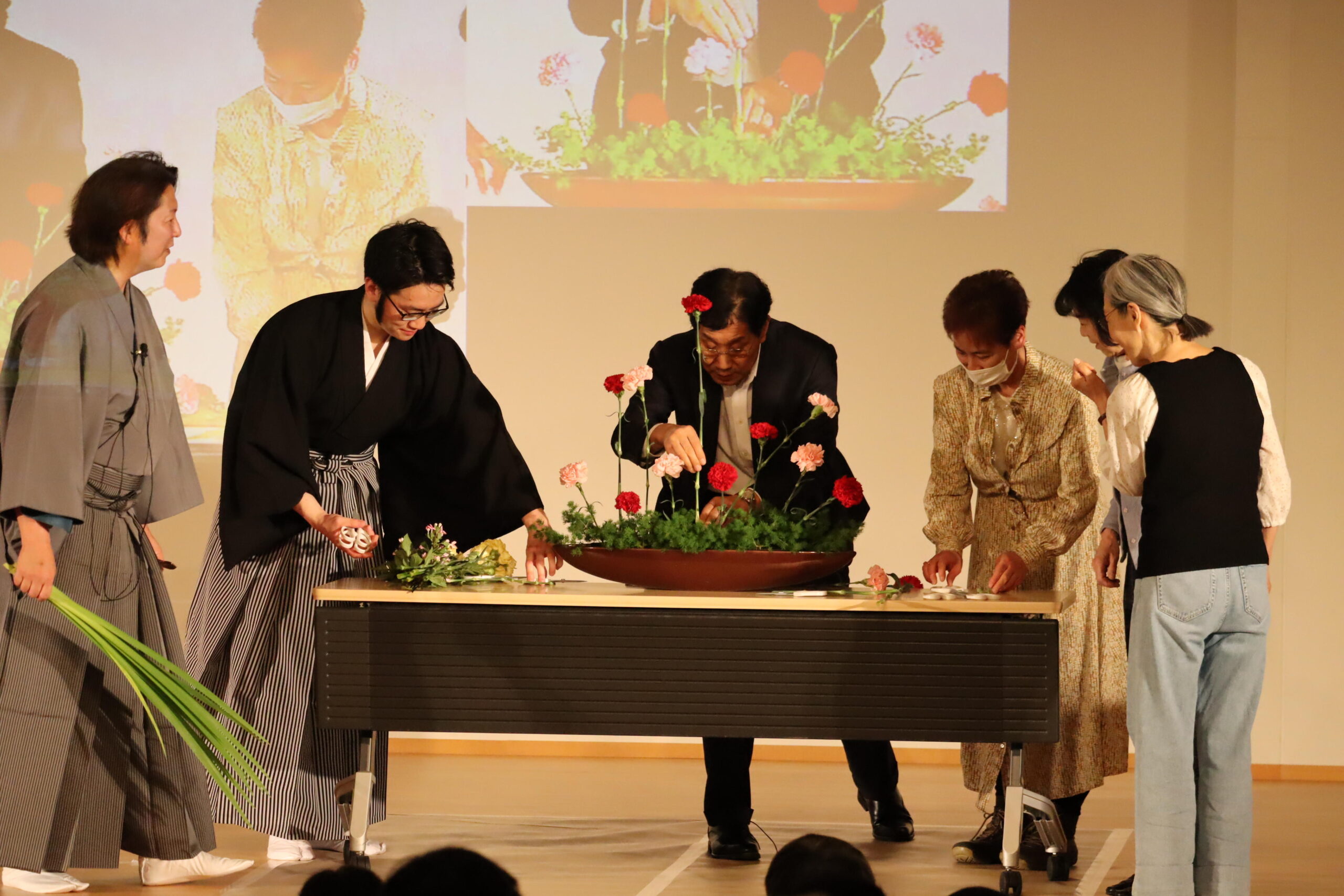 5月19日は藤井 真 池坊短期大学准教授が池坊のいけばなの歴史や花形の意味、そこに込められた精神について講演。いけばなのデモンストレーションも行われ、参加者と一緒にいける場面もあった。お迎え花として立てられた立花(りっか)を含め、約2時間の間に5つもの花を迷いなく美しくいける様子に参加者も見入っていた。