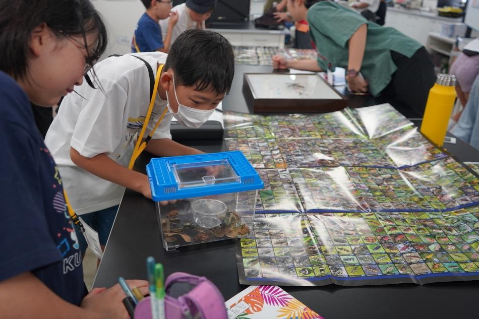 東京家政大学では7月31日に開講。環境共生学科・片田先生による「ヒトは生き物に名前をつける。『生き物の”名前”採集プロジェクト』」では、自然豊かなキャンパスの中でさまざまな生き物を探し、実際に見て触れて観察することで、生き物を身近に感じる体験をした。また、図鑑や標本で捕まえた生き物の名前を調べ、子どもたちはより理解を深めることができた。