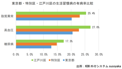 「令和3年度江戸川区食育食生活調査」によると、国の目標に比べ、江戸川区民の塩分摂取量は男女ともに高い傾向である一方、食物繊維や野菜・果物の摂取量は少ないことが分かっています。また、偏った食事などが原因となる生活習慣病の区民の有病者率も、都内全体よりも高くなっています。