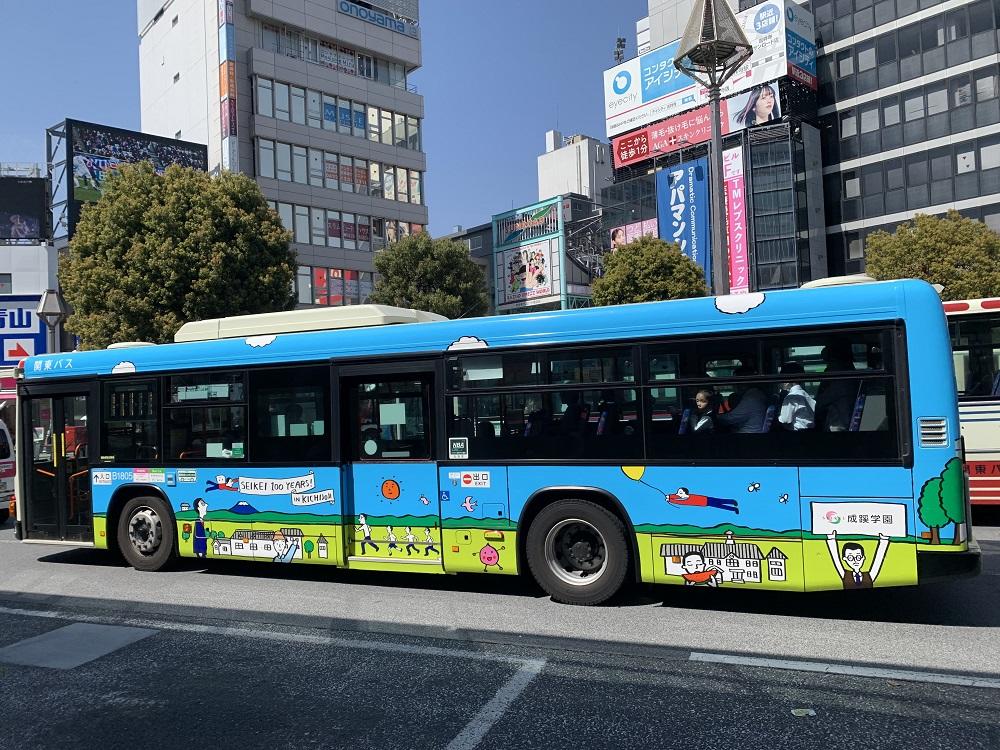 関東バスと西武バスで、それぞれ異なるデザインのオリジナルラッピングバスを運行。吉祥寺・成蹊学園の現在と、池袋時代の成蹊学園をテーマに、吉祥寺の街や学園のシンボルとも言える建物や公園、校舎などが、個性豊かな人や動物らとともに描かれています。