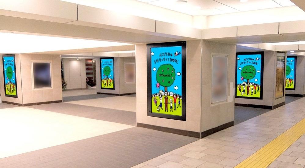 6柱12面の大型ディスプレイに、吉祥寺の街と成蹊の名の由来である桃の木を背景に、学生や生徒、街の人々が次々に集い「成蹊学園は池袋から吉祥寺に移転して100年」であることをお知らせするアニメーション広告を出現させます。