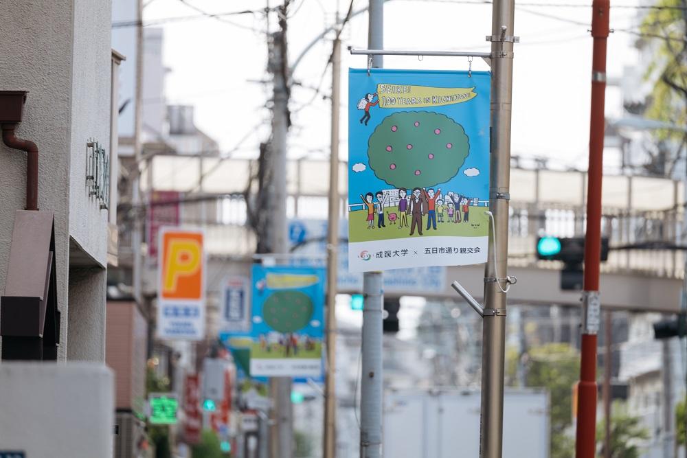 吉祥寺駅からのキャンパスまでの通学路となる「平和通り」「公園通り」「五日市街道」の3つの通りにフラッグを掲出。各通りで異なるデザインで、吉祥寺の街やキャンパス、そこに集う人々や学生、学園マスコットキャラクター・ピーチくん等を描きます。