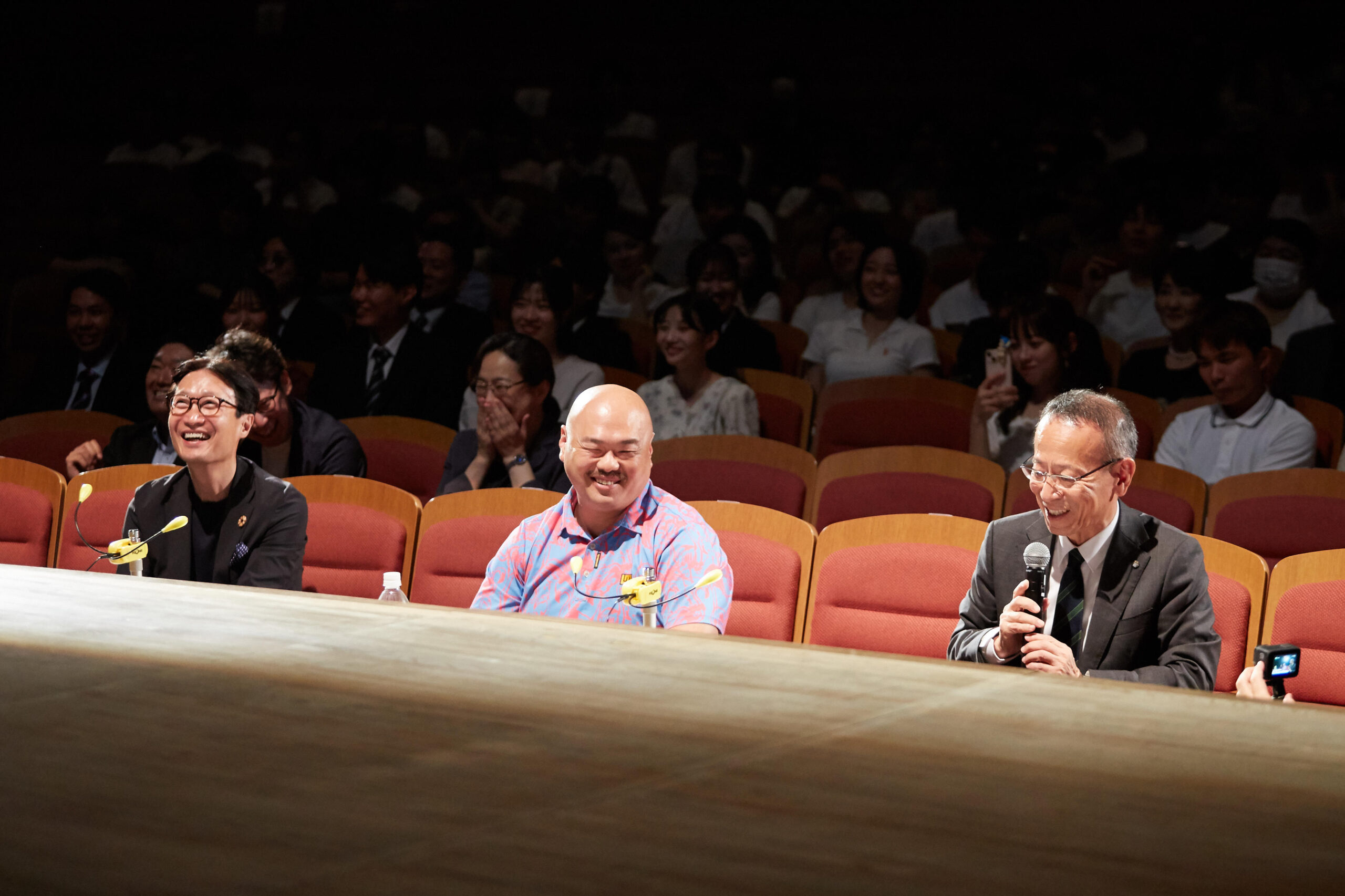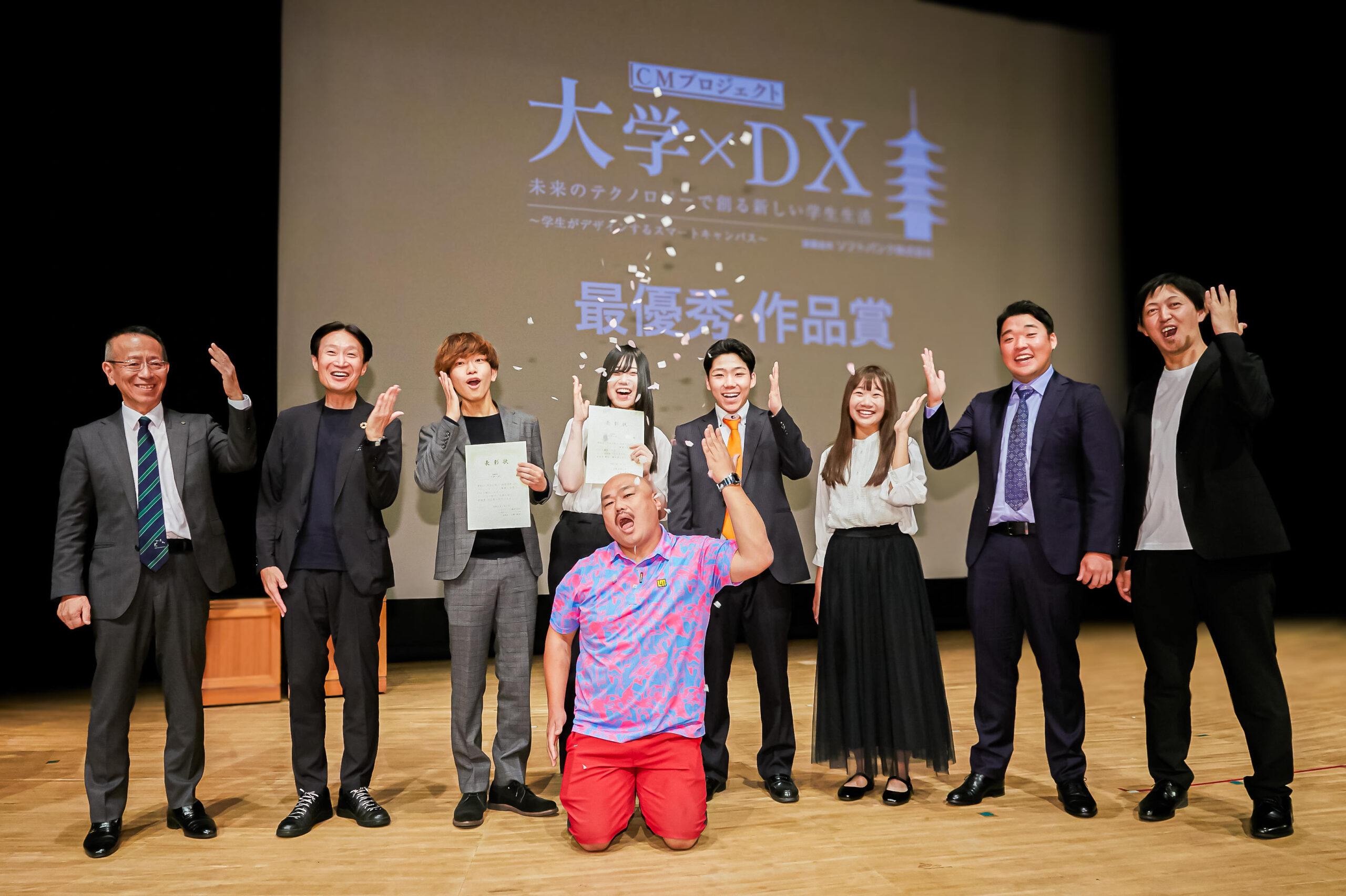 京都産業大学経営学部は、ソフトバンク株式会社と連携し、『大学DXと未来のキャンパスライフ」をテーマに、学生が企画から制作まで動画制作全てを行うCMプロジェクトを実施。完成披露発表会にはお笑いタレントの安田大サーカスのクロちゃんを審査員に迎え、盛大に授賞式が開催された。