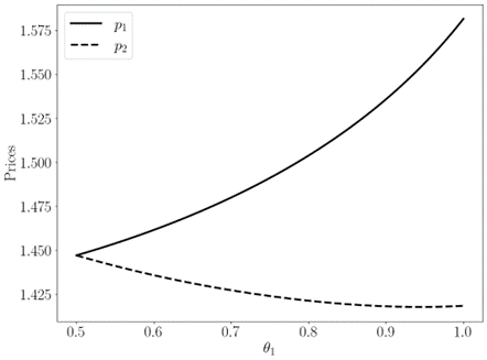 図1 本研究チームが開発した数理モデルを「規模の異なる2企業」という設定でシミュレーションした結果をグラフにしたもの。横軸は最大手企業の相対的な規模を表す。0.5 の時にはライバル企業と同じ規模なので価格は両者で同一となるが、1に近づくにつれて最大手企業の価格p1 がライバル企業の価格p2 よりも高くなっていくことがわかる。