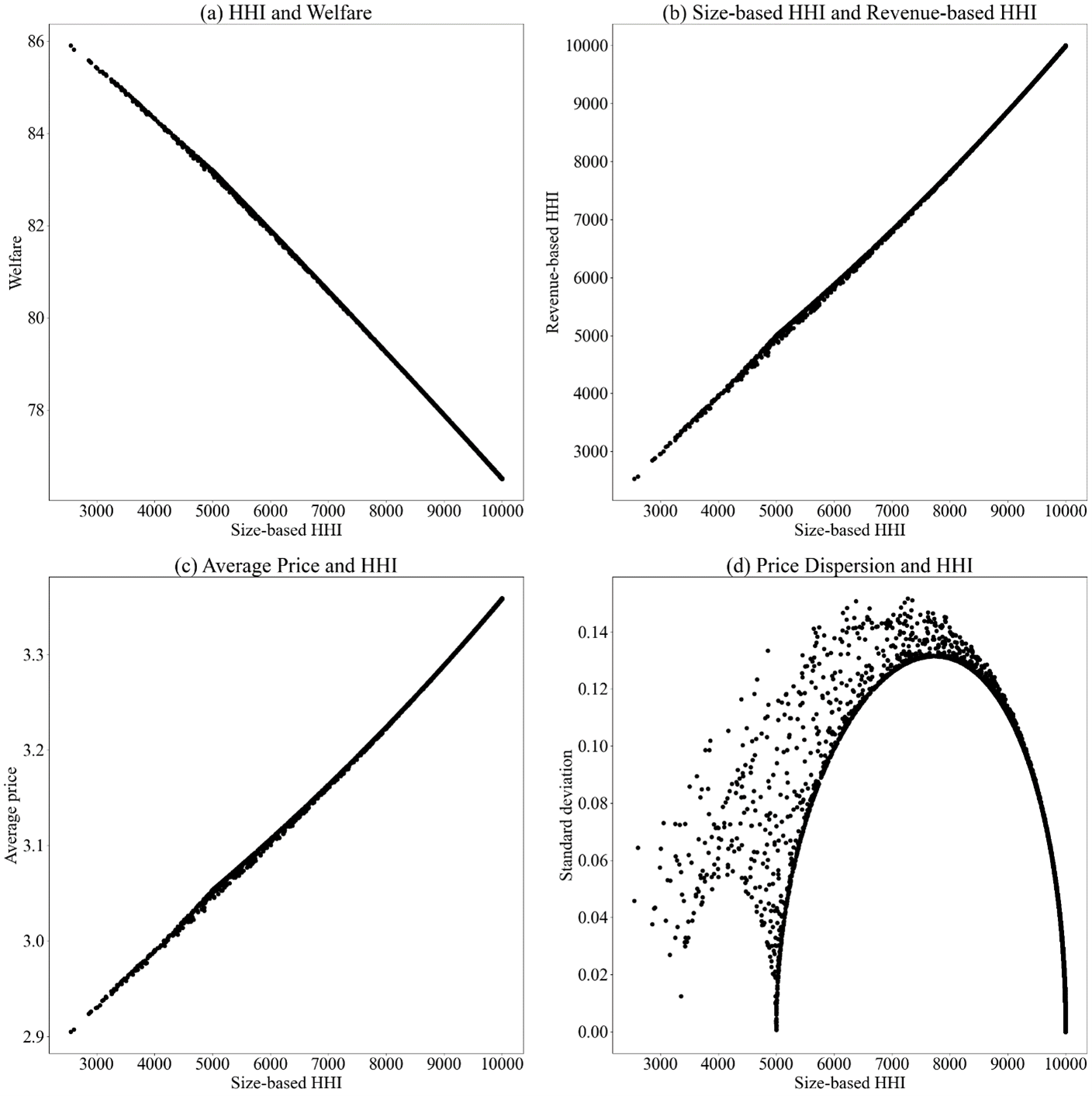 注2)を横軸にとって、他の指標との関係をシミュレーションにより明らかにした。左上図では、実務上利用されているハーフィンダール・ハーシュマン指数がモデル上の経済における社会厚生の代理変数として機能していることが明らかになった。左下図はハーフィンダール・ハーシュマン指数が上昇して独占度が上がるにつれて市場での平均価格が上昇していることが分かる。右下図の縦軸は価格のちらばりを表す。HHI = 1の時は1社による独占なので価格の分散はゼロになる。HHI = 5000は対称な2企業による複占となるため価格が同じになるためやはり分散ゼロである。左上図と比べると、価格の散らばり具合と経済厚生に明確な関係は認められない。