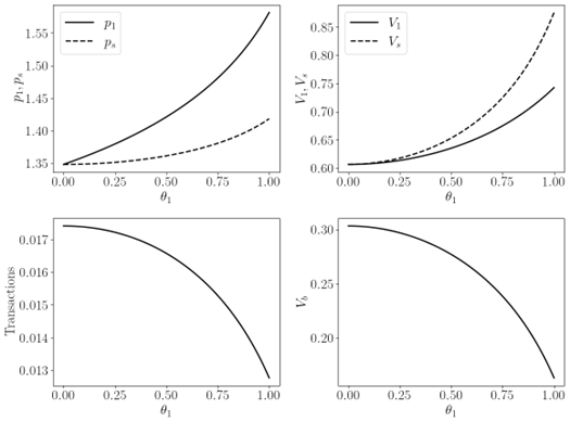 図2 本研究チームが開発した数理モデルを「最大手企業1社と無数の零細企業」という設定でシミュレーションした結果をグラフにまとめたもの。左上図と図1を比較すると、最大手企業の規模が拡大するにつれて、最大手だけでなく零細企業の価格も上昇していることがわかる。実は、零細企業の場合、大企業の市場支配力に「タダ乗り」して自社の価格を引き上げることが可能であることが判明した。タダ乗りの結果、大企業よりも高い利益を得ることに成功している(右上図の点線が零細企業の利益)。しかしながら、最大手企業の規模拡大に従って取引の総量が減少(左下図)し、消費者が得る社会厚生も減少(右下図)してしまう。