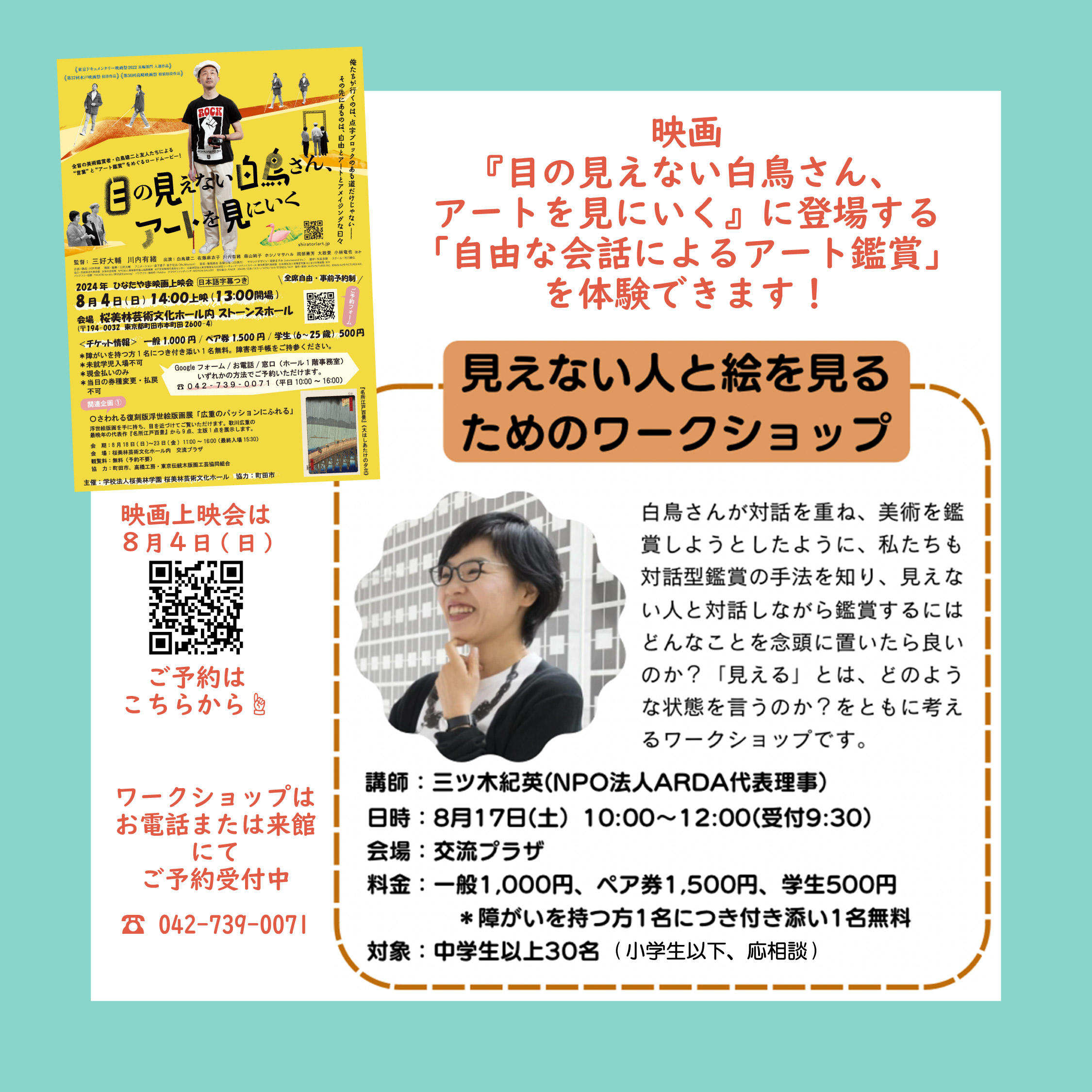 桜美林芸術文化ホールでは8月に、見えない壁をアートで飛び越え、多様な人々と繋がっていくことをテーマとした3事業を実施。全盲の白鳥建二氏が対話を重ねて美術を鑑賞しようとしたドキュメンタリー映画の上映、白鳥氏による絵の見方を学ぶワークショップ、実際に手に持って鑑賞できる復刻版浮世絵版画展を、それぞれ開催する。