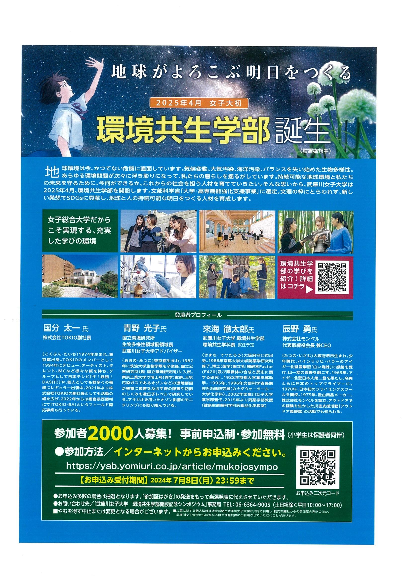 地球環境をめぐる様々な課題に新たな発想で挑む人材を育成するため、武庫川女子大学は2025年4月、女子大初の環境共生学部を開設します。新学部開設に先立ち、フィールドワークを起点とする教育の内容や魅力、開設の意義を広く発信するため、7月21日(日)13時から、中央キャンパス公江記念講堂で、環境共生学部開設記念シンポジウム「地球がよろこぶ明日をつくる―”環境共生”という約束―」を開催します。