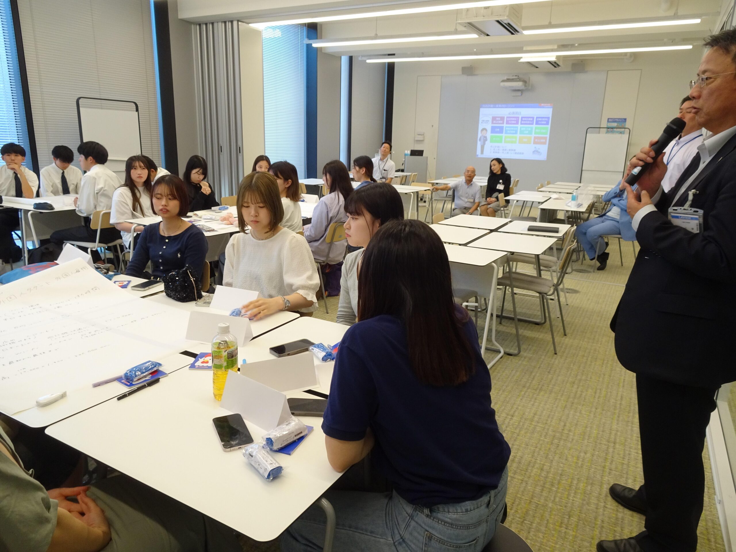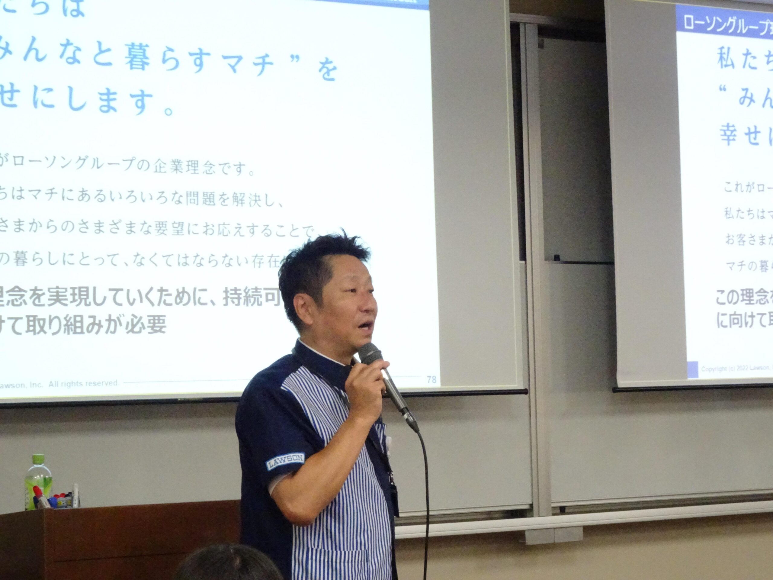 プロジェクトの第一段階となる講義とワークショップが6月5日、武庫川女子大学中央キャンパスで行われ、ローソン近畿カンパニー近畿エリアサポート部 マネジャーの阿部浩一さんら社員6人が、ローソンのサステナビリティの取り組み、事業概要、店舗開発などについて説明。この後、学生、生徒はグループに分かれて「出店計画~未来のローソン」をテーマにワークショップを行い、グループごとに出店を考える地域、選んだ理由などの検討内容を発表しました。